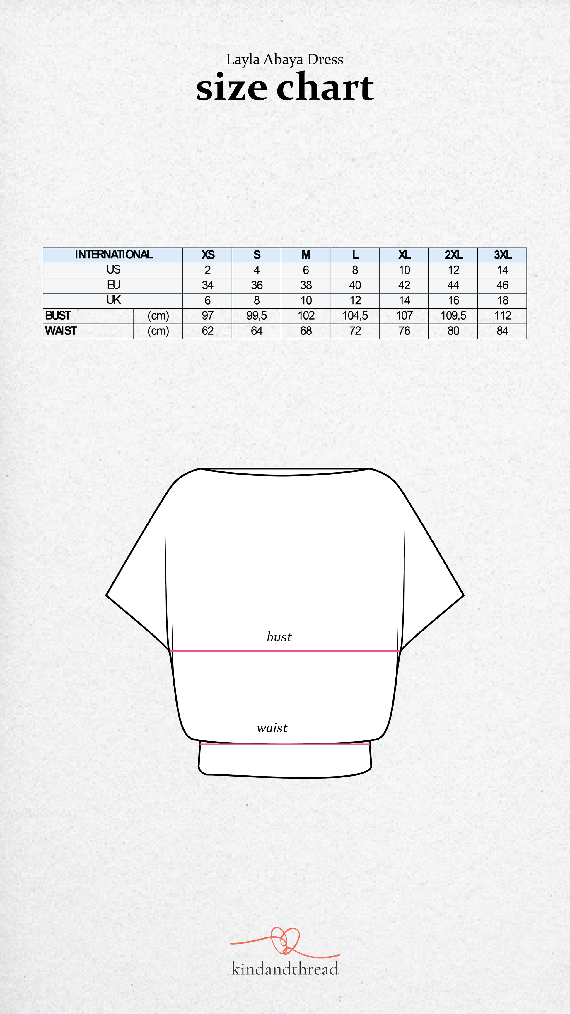 Size chart with detailed measurements